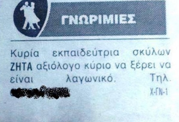 Τρίκαλα: Η αμίμητη αγγελία που κάνει θραύση στο facebook !Με αγγελία που φιλοξενείται σε τοπική εφημερίδα, γυναίκα αναζητά… «λαγωνικό» για σχέση! Συγκεκριμένα και όπως φαίνεται στη φωτογραφία που κάνει θραύση στο facebook, η γυναίκα που δηλώνει εκπαιδεύτρια σκύλων ζητά αξιόλογο κύριο να ξέρει να είναι… λαγωνικό! Όπως αντιλαμβάνεστε η παρακάτω εικόνα κάνει το γύρο του διαδικτύου και προκαλεί χαμόγελα σε μικρούς και μεγάλους…