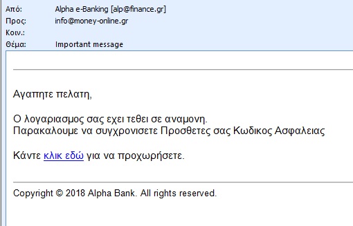Ένα νέο e-mail απάτη έχει σταλεί σε χιλιάδες ελληνικές διευθύνσεις πελατών της Alpha Bank τις τελευταίες ώρες, στοχεύοντας να τους παραπλανήσει για να υποκλέψει τους κωδικούς τους.