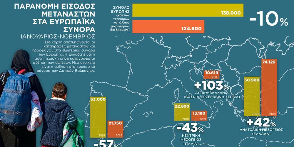 Το φετινό 11μηνο, στην Ελλάδα σημειώθηκε αύξηση κατά 42% όταν στην Ισπανία οι Αρχές κατέγραψαν μείωση 57% και στην Ιταλία μείωση 43%. Για πρώτη φορά η ευρωπαϊκή συνοροφυλακή κατέγραψε σημαντική αύξηση και στα εσωτερικά σύνορα, ειδικά στην περιοχή Σερβίας- Βοσνίας Ερζεγοβίνης, όμως δεν αφορά νέες καταγραφές στη συντριπτική τους πλειονότητα, είναι δηλαδή μετανάστες που έχουν καταγραφεί ξανά είτε στην Ελλάδα είτε σε άλλη χώρα, αλλά μέσω των δουλεμπορικών κυκλωμάτων κατάφεραν να φτάσουν στα Δυτικά Βαλκάνια.